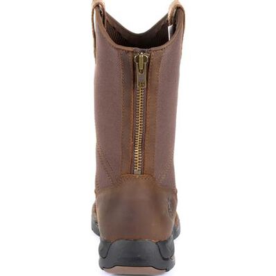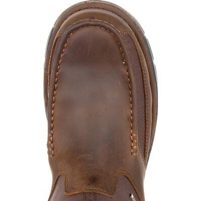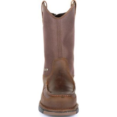 This Georgia Boot Athens pull on work boot features a 900D nylon and full-grain leather moc-toe upper with an oil, slip, chemical, abrasion, and heat resistant outsole. Leather pull tabs and a rear zipper make it easy to get this boot on and off.