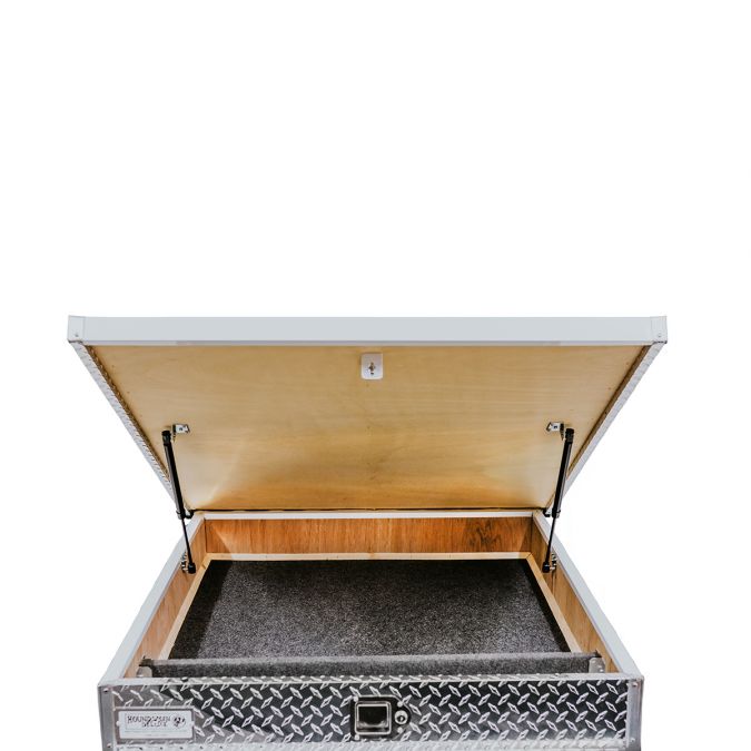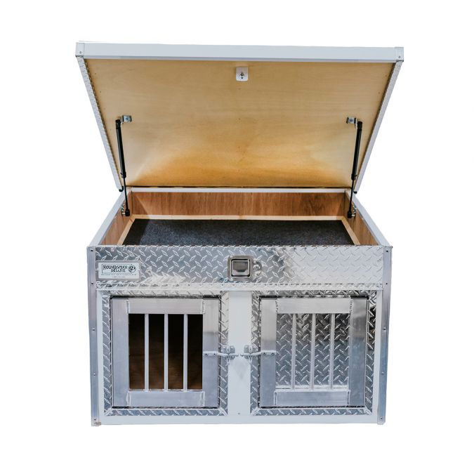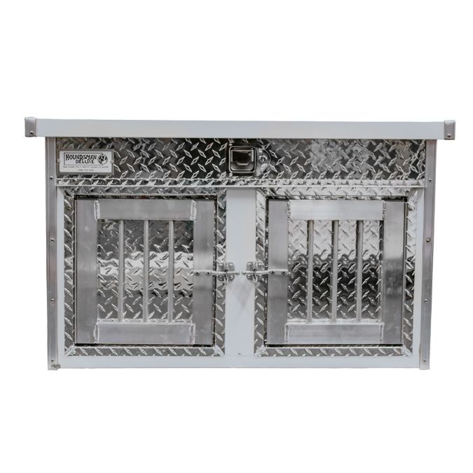 When you need to get your hunting dog from home to your hunting ground, you need one of our hand-crafted Deer Creek Houndsmen Deluxe Dog Boxes. This 38″ x 46″ box comes complete with storage on the top to fit your hunting accessories. The size is great for smaller trucks. It features handles, o-rings, carpeted storage on the top, 2 doors with door covers, dividers to keep dogs separate and diamond starbrite/tread plate trim.