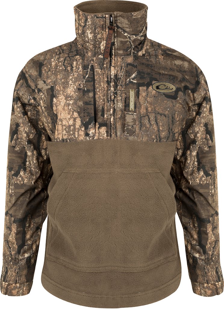 Our patented Eqwader™ technology  revolutionized waterfowl clothing and has been a core piece of the Drake Waterfowl brand since day one. Just like the Earth’s equator is the dividing line between two distinct temperate zones, we noticed a similar dividing line on the body when you are wearing chest waders: cold, hostile conditions above the waders, and warm, humid conditions underneath the waders. Our unique combination of waterproof/breathable fabric on the sleeves and upper body matched with ultra-breathable fleece on the lower body introduced a whole new level of comfort and performance when wearing chest waders. The moisture-wicking fleece on the lower torso is 15 times more breathable than the upper waterproof material and works to prevent the build-up of perspiration and moisture vapor. These dual zones of protection keep you dry both inside and outside your waders.
